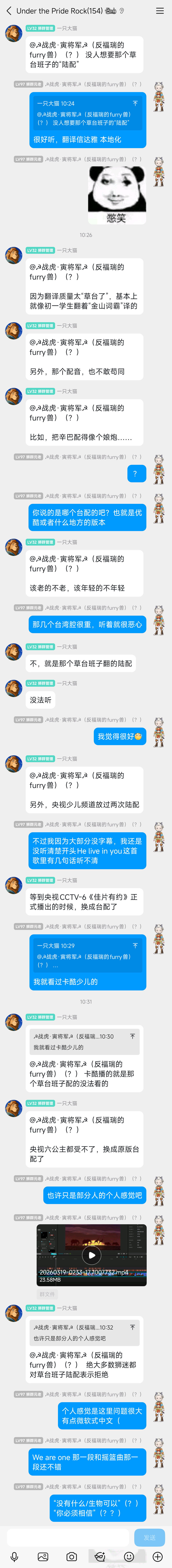 然而个人实际观感并无过多异常,内地版除部分台词疑似机翻外基本能达到“信达雅、本土化译名”(例如歌词能保持字数与英文原版的发音节奏同步且音量平稳),反而台配版因为台湾腔浓度过高而听起来别扭,台版也存在部分翻译的不足之处(如“荒原族”翻译成“荒原人”)。