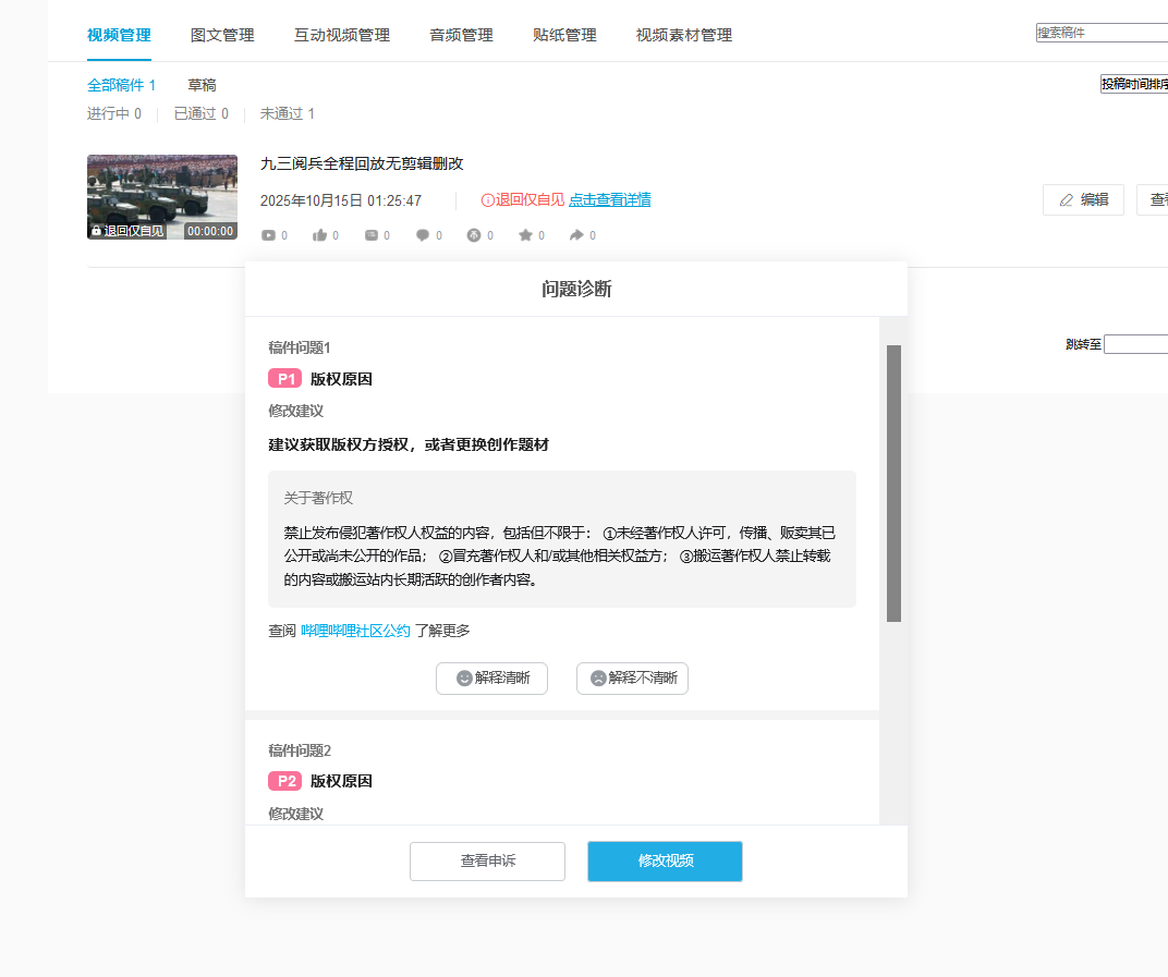 “不予审核通过”?P1你个头P1!我瞅瞅你们那P1标准是他妈镶了金边还是贴了狗皮?宣扬黑社会?拐卖儿童?代孕?我视频里哪一帧沾着这些脏玩意儿了?虚空索敌玩挺溜啊?睁开你们的狗眼看看清楚!是八一南昌起义的枪声不够响?还是红旗插上总统府不够亮?是复兴号跑得不够快?还是空间站建得不够高?嗯?!
